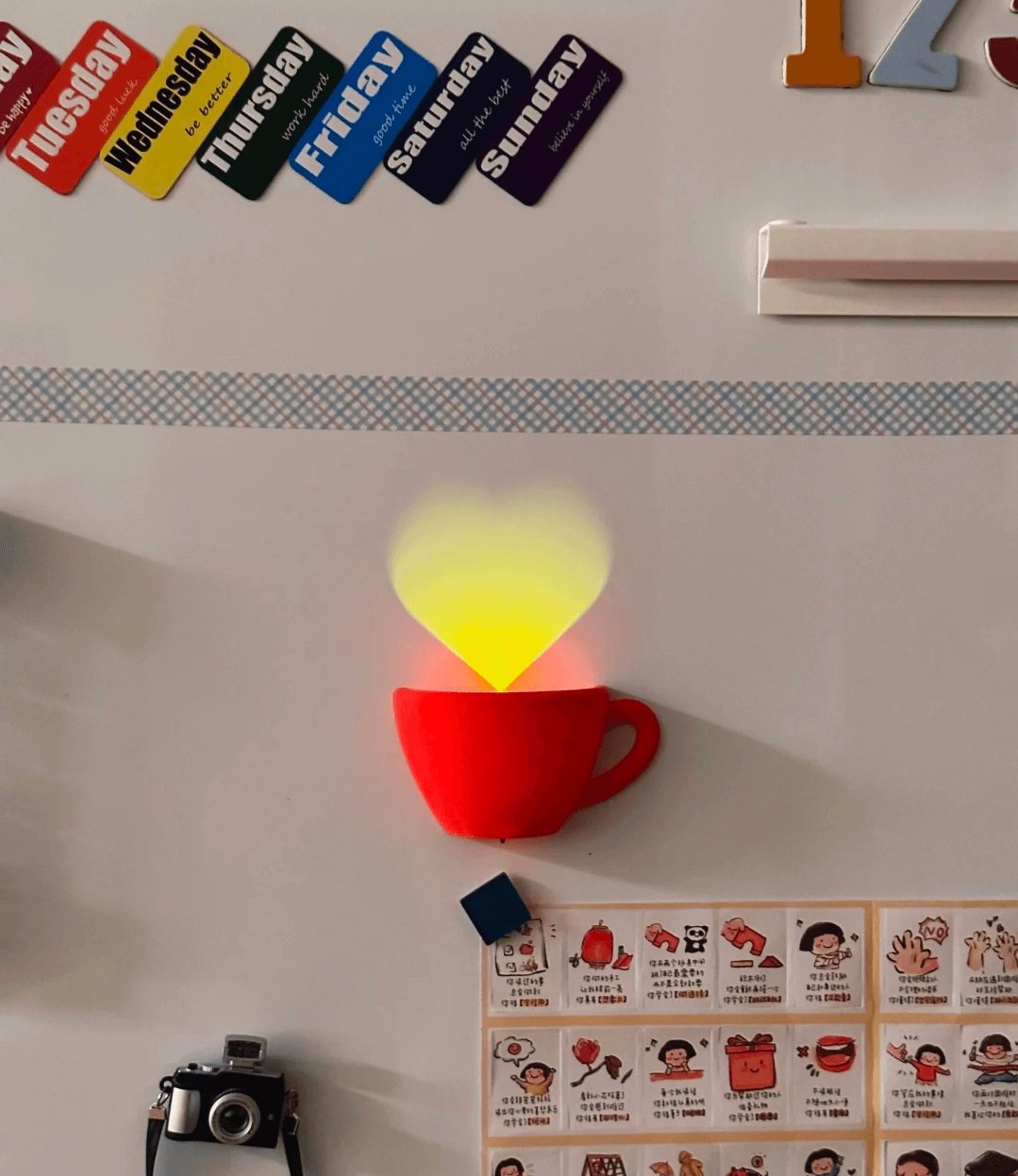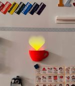 Romantic design elements, a coffee cup fridge magnet that can be opened to reveal a heart shape, is an interesting gift to present to your loved one.